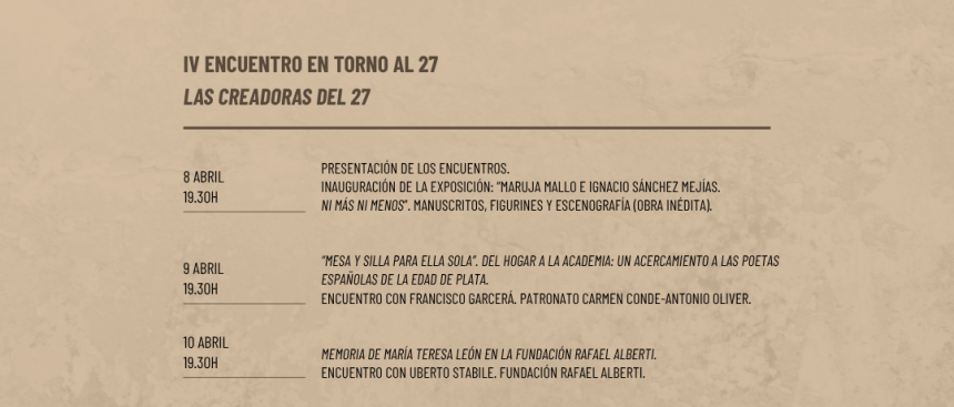 La programación ha previsto dos encuentros en el Archivo-Museo 'Sánchez Mejías': el jueves con Francisco Garcerá ('"Mesa y silla para ella sola". Del hogar a la academia: un acercamiento a las poetas españolas de la edad de plata') y el viernes con Uberto Stabile ('Memoria de María Teresa León en la Fundación Rafael Alberti'). Ambos comenzarán a las 19:30 horas.
