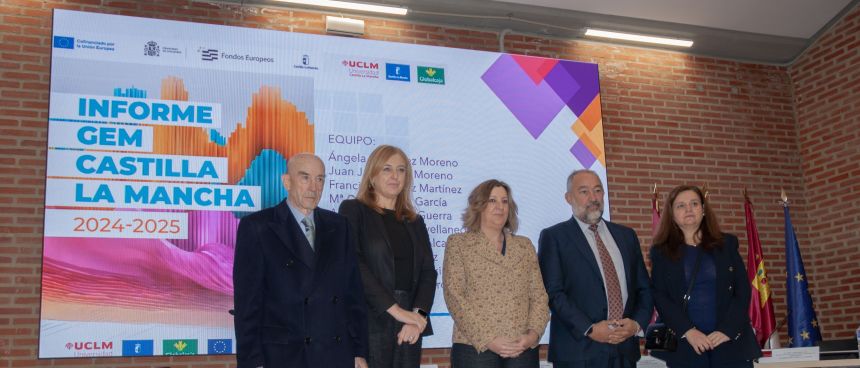 La Universidad de Castilla-La Mancha, la Junta de Comunidades y Globalcaja, a través de su fundación, han dado a conocer esta mañana el Informe GEM (Global Entrepreneurship Monitor) Castilla-La Mancha 2024-2025 durante un acto en el que han estado presentes el rector, José Julián Garde; la consejera de Economía, Empresas y Empleo, Patricia Franco; el presidente de la Fundación Globalcaja HXXII, Rafael Torres; la vicerrectora de Innovación, Empleo y Emprendimiento Ángela González, también codirectora del informe junto al catedrático Juan José Jiménez, y Ángela Triguero, Decana Facultad CC Económicas y Empresariales. Les acompañaron en la presentación, celebrada en el Campus de Albacete, la directora de Compromiso de Globalcaja, Carla Avilés; el vicerrector de Economía y Planificación, Francisco Sáez, y representantes de diferentes administraciones, facultades de la universidad, alumnos y medios de comunicación.